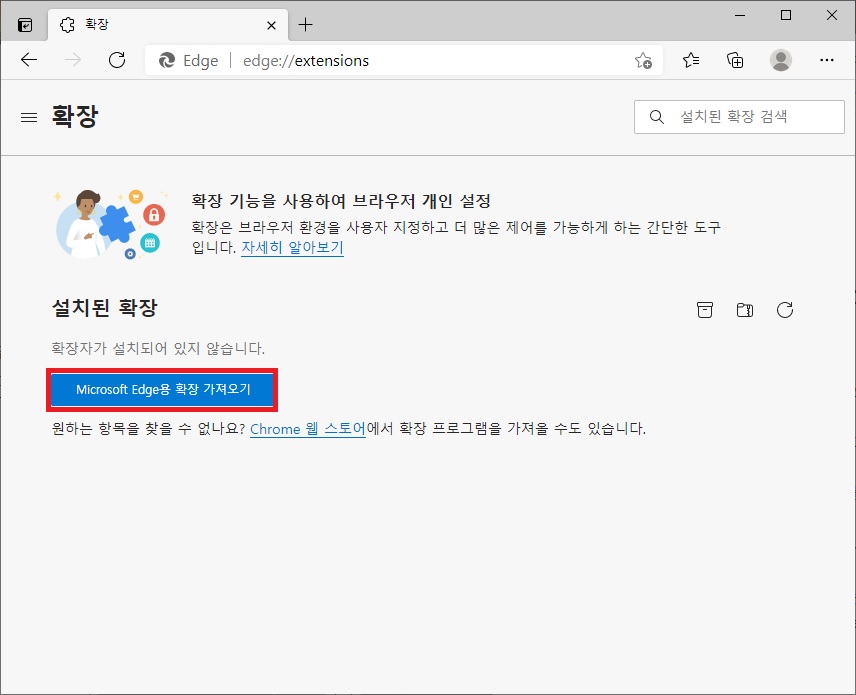 엣지 추가 기능 페이지는 크롬의 웹 스토어와 같은 사이트라고 보면 되는데 추가 기능 페이지의 이동은 엣지의 확장 페이지에서 [Microsoft Edge용 확장 가져오기] 버튼을 클릭하거나 아래의 링크를 클릭하여 이동하면 된다.