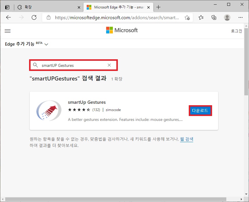 엣지에서 무난하게 사용 가능한 마우스 제스처 확장 프로그램에는 'smartUP Gestures'가 있으니 이를 검색한 뒤 [다운로드] 버튼을 클릭하여 확장을 추가하도록 하자.