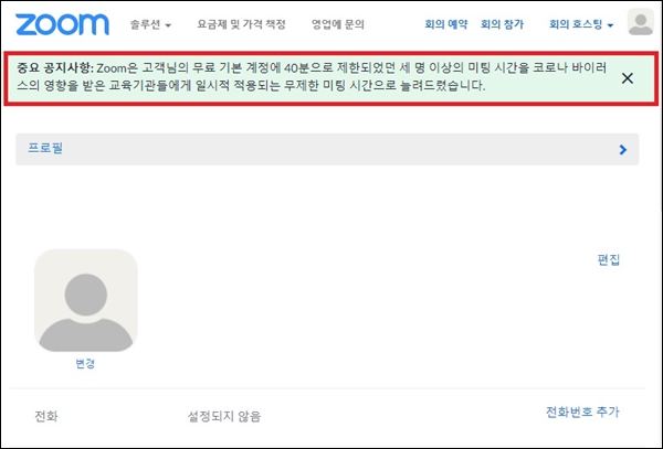 - 중요 공지사항 Zoom은 고객님의 무료 기본 계정에 40분으로 제한되었던 세 명 이상의 미팅 시간을 코로나 바이러스의 영향을 받은 교육기관들에게 일시적 적용되는 무제한 미팅 시간으로 늘려드렸습니다. |