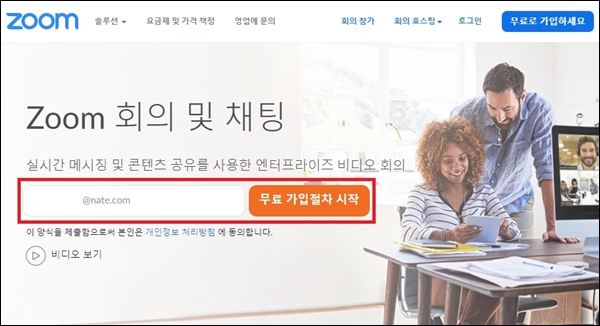 줌 홈페이지에 접속한 뒤 화면에 바로 보이는 업무용 이메일 입력 란에 네이트 메일 계정을 입력하고 무료 가입 절자 시작 버튼을 클릭하도록 하자.